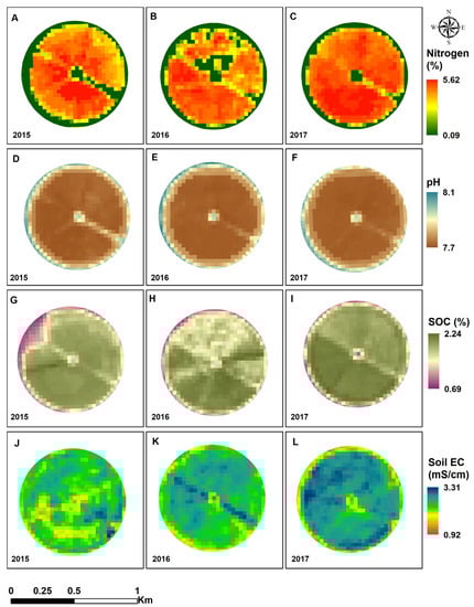 Classified maps of soil physicochemical properties of the experimental field. Nitrogen (A–C), soil pH (D–F), soil organic carbon (G–I) and soil electrical conductivity (J–L) maps for the year 2015, 2016 and 2017 of experimental field.