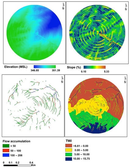 There are several available approaches to generating the DEMs; examples include the widely used Kriging and inverse distance weighting (IDW) approaches []. Kriging is a geostatistical approach, whereas the IDW is a deterministic method. Due to the simplicity of the IDW model, which works based on mathematical functions and the procedure performed on the sample points collected from the RTK GPS receiver, it is considered suitable for DEM generation []. The obtained DEM data were subjected to further analysis using the spatial analyst tool (hydrology) of the Esri ArcGIS for the generation of the surface layers of topographic indicators including the slope (SL), the flow direction (FD), and the flow accumulation (FA). To assess the cumulative effect of the topographic attributes on the crop yield, the topographic wetness index (TWI) as developed by Kirkby and Beven [] was calculated, as in Equation (1).