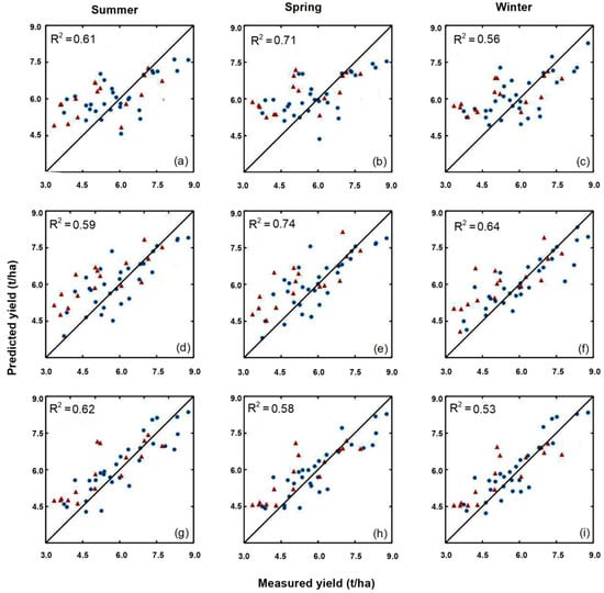 A scatter plot between actual yield (YA) and predicted yield (YP) of (a–f) Alfalfa and (g–i) Rhodes grass. The round (dark blue) and triangular (red) points represent the training and validation datasets, respectively.