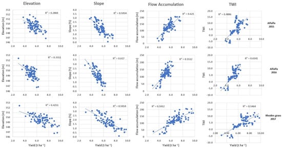 The obtained results of the FA and crop yield (R2 = 0.551 to 0.621) are in agreement with Marques da Silva and Silva [], who reported a positive correlation between alfalfa yield and the FA (R2 = 0.618; p = 0.0001). Moreover, the significant relationships between the crop yield and the topographic attributes can be justified by the water accumulation and storage, as well as different rates of water consumption by plants at upslope and downslope positions [,]. The obtained results exhibited no essential differences in the responses of Rhodes grass and alfalfa crops to the elevation. However, the SL showed a highly significant impact on alfalfa yield in 2016 and a less significant impact on Rhodes grass yield in 2017. The obtained results also revealed that the TWI was one of the essential factors affecting the yield of Rhodes grass and alfalfa.