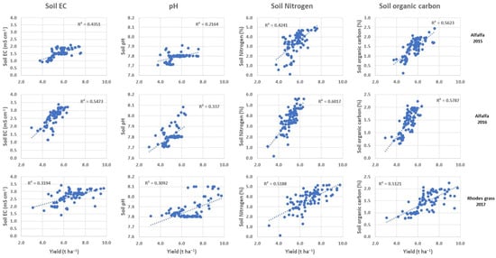 Regression analysis results, represented by the coefficient of determination (R2) between soil physicochemical properties (pH, EC, SOC and N) and the crop yields, along with the Pr > Fare, are presented in Table 8. Both SOC and N components had a significant effect on the yields of both alfalfa and Rhodes grass crops (Figure 7). Soil EC, however, only had a significant impact on the alfalfa yield, in agreement with the earlier study of Emam et al. [], which reported a negative effect between salinity stress and alfalfa. Soil pH revealed no significant impact on the yields of both studied crops. In general, of the studied soil properties, soil N had the most significant impact on both alfalfa and Rhodes grass. These results are in agreement with Bernardi et al. [], who reported a weak relationship between alfalfa yield and soil pH.