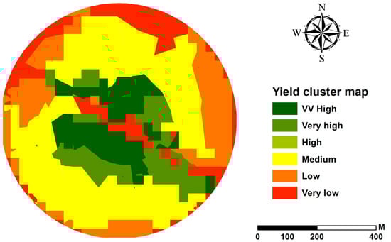 - The generated yield cluster map indicated that the majority area (37.56%) of the experimental field was occupied by the medium-yield class, followed by the high-yield class (33.03%), and the rest of the experimental field (29.41%) is characterized as a low-productivity area.