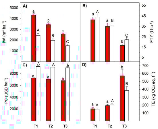 The ANOVA showed significant effects of irrigation timing treatments (IT) in all of the assessed indicators, whereas the interaction IS × IT was significant for IW and PC (Table 1). The trial’s effect (random factor) did not show significant variations in most indicators (except FTY, data not shown). IW ranged between 2425.8–4848.8 and 696.0–3470.5 for FI and DI, respectively. On average, FI spent 1878.4, 1447.1, and 889.2 more IW than DI in T1, T2, and T3, respectively (Figure 1A). The use of water irrigation thresholds significantly reduced the IW in both irrigation systems (Figure 1A). FTY ranged between 9.8–58.1 and 12.4–57.7 t for FI and DI, respectively. FTY showed an average reduction of 6.3, 1.1 and 28.5% under FI compared to DI in T1, T2 and T3, respectively (Figure 1B). Under FI, FTY under T1 and T2 was significantly higher than FTY-T3, and under DI, the use of water irrigation thresholds significantly reduced the yield (Figure 1B). PC ranged between 6765.7–7371.5 and 8395.4–9986.3 USD for FI and DI, respectively. This indicator was 21.2, 22.8, and 24.3% higher under DI than FI in T1, T2, and T3, respectively (Figure 1C). Additionally, the average BCR values for T1, T2, T3 were 2.0 ± 0.12, 1.6 ± 0.11, 1.0 ± 0.08 and 2.4 ± 0.20, 2.1 ± 0.22, 1.0 ± 0.11 for DI and FI, respectively. PC showed significant differences among IT in each IS. TE ranged between 94.5–1064 and 104.2–737.5 kg -eq t fresh corresponding to FI and DI, respectively (Table 2). The average difference of TE of DI related to FI was −3.9, +9.1, and −184.5 kg -eq t fresh in T1, T2, and T3, respectively (Figure 1D). T3 showed significantly higher TE values than T1–T2 for both IS. The main source of TE was fertilizer inputs (33.5–47.2%) in T1–T2 for both IS, followed by seed production (27.4–28.7%) in T2 and energy use activities (24.7–27.0%) in T1 (Table 2). Regarding T3, it was seed production (40.1–43.4%) followed by fertilizer inputs (33.7–35.7%). In all treatments, off-farm transport activity was negligible (<1%).