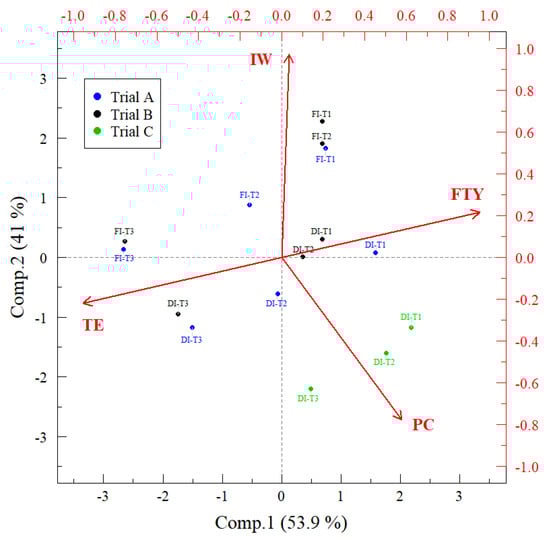 The extracted components with eigenvalues > 1 represented 94.9% of the total cumulative variance (Table 3). FTY and TE mainly explained the first principal component (PComp) with positive and negative signs, respectively. In contrast, the second PComp was represented primarily by PC and IW, with a negative and positive sign, respectively (Table 2, Figure 2). FI-T2 showed higher values of IIN for scenarios IV–VII (0.52–0.71), reaching in VII the maximum value of 0.71 in all the scenarios. Additionally, IIN was higher for FI-T1 with values of 0.42 and 0.50 under scenarios II and III, respectively (Figure 3). DI-T3 showed lower IIN values (0.19–0.29) in all the scenarios (Figure 3). The treatment with higher IIN in most scenarios (FI-T2) was in the group of higher FTY and low IW, TE and PC, whereas DI-T3 treatment with lower IIN in all scenarios was grouped in the polygon of lower FTY and IW and higher PC and TE (Figure 4).