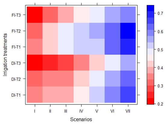 Average values of the integrated index for each treatment (T1, T2, and T3 for control and thresholds of 0.4 and 0.6 crop water stress index for irrigation timing) under drip (DI) and furrow (FI) irrigation for seven scenarios: (I) “highly important” fresh tuber yield (FTY), with other indicators labeled as “unimportant”, (II) “highly important” FTY and “moderately important” production cost (PC), with the other indicators labeled as "unimportant”, (III) “highly important” FTY and PC, with the other indicators labeled as “unimportant”, (IV) “highly important” FTY and PC, “moderately important” total irrigated water (IW), and “unimportant” total C emissions (TE), (V) “unimportant” TE, with the other indicators labeled as “highly important”, (VI) “moderately important” TE, with the other indicators labeled as "highly important”, and (VII) “highly important” for all the indicators.