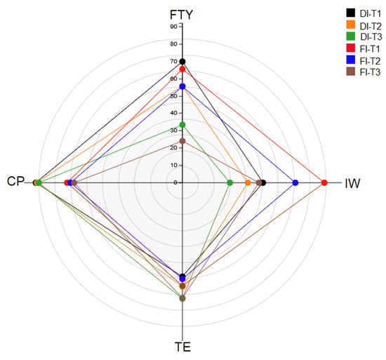 Radar diagram illustrating drip (DI) and furrow (FI) irrigation systems under control (T1) and thresholds of 0.4 (T2) and 0.6 (T3) of the crop water stress index (CWSI) for agronomic (FTY), environmental (TE), and economic (PC) indicators. See abbreviations in Table 1.