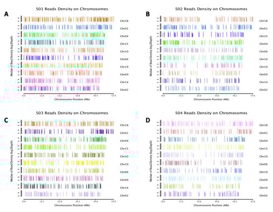 Mapped reads displayed on different soybean chromosomes. (A) S01—Nannong 10-1 mock; (B) S02—Nannong 10-1 at 12 h post-inoculation (hpi); (C) S03—06-070583 mock; (D) S04—06-070583 at 12 hpi.