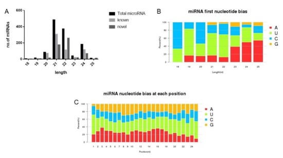 Due to the specificity of dicer enzymes and dicer-like (DCL) enzymes, the final generation of mature miRNA is mainly concentrated in the 20 nt to 24 nt classes. In this study, 555 new miRNAs and 528 known miRNAs were predicted in the four samples. The length distributions of the known and new miRNAs identified are shown in Figure 3, vary from 19 to 25 nt, with the majority in the 20-21 nt. Since the AGO protein of the miRNA pathway preferentially associates 21 nt small RNAs starting with a 5′ uridine, so a strong bias in the identification and cutting of precursor miRNA at the 5′ end of the first base pair of U. The typical miRNA base proportion was obtained by analyzing the base preference of miRNA. For the first base preference of the 5′ end and the base preference of the mature sequences of the total miRNAs, see Figure 3b,c.