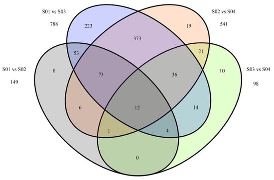 Venn diagram illustrating specific Phytophthora sojae-responsive miRNAs in Nannong 10-1 (S01—Nannong 10-1 mock; S02—Nannong 10-1 at 12 hpi) and 06-070583 (S03—06-070583 mock; S04—06-070583 at 12 hpi).