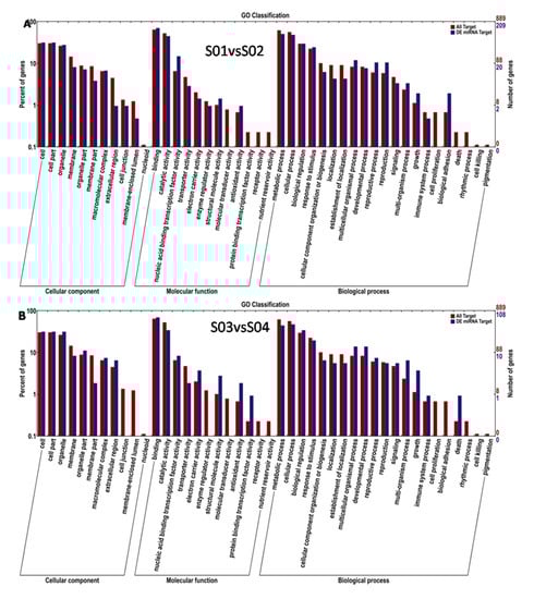GO analysis of miRNA target genes identified in S01 vs. S02 (A) and S03 vs. S04 (B). The digits on the left y-axis and right y-axis indicate the percentage and enrichment of miRNA targets, respectively. Only the target genes identified for miRNAs by RNA sequencing were considered.