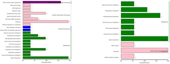 In total, 1484 target genes were predicted for 585 microRNAs (Table S3). The division of known and novel microRNAs resulted in 356 known miRNAs with 957 targeted genes and 229 novel miRNAs with 587 predicted target genes. Among the 1484 target genes, 1443 were annotated (Table S4). The numbers of annotated miRNA target genes in the different samples are shown in Table S5. The GO annotation showed that these target genes could participate in various cellular processes, such as “defense response”, “the oxidation–reduction process”, “protein phosphorylation”, and “the regulation of transcription of DNA-template” (Figure 5). Based on the results of TOPGO, the two most basic “cellular component” categories were “nucleus” and “integral component of membrane”; in “biological process”, the top two categories were “the regulation of transcription, DNA-template” and “defense response”; and in “molecular function”, the top two categories were “DNA binding” and “ATP binding” in the resistant cultivar. Additionally TOPGO showed that the basic “biological processes” included “metabolic processes”, “cellular processes”, and “biological regulation”, whereas the “molecular processes” included “binding” and “catalytic activity” and the cellular components included “cells”, “cell parts”, and “organelles”(Figure 6). Meanwhile, 21 KEGG pathways were classified in the resistant cultivar Nannong 10-1, and 10 KEGG pathways in the susceptible line 06-070583, and the most common pathways were “zeatin biosynthesis”, “plant hormone signal transduction”, “ribosome”, “cyanoamino acid metabolism”, “nucleotide excision repair”, and “phenylpropanoid biosynthesis”, which are shown below. We also found several pathways related particularly to disease response (Figure 7) [,].