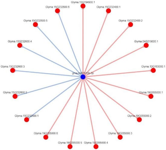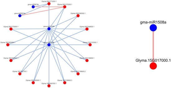 Degradome-based gma-miR1509–target interactions and network. Note: we used DPMIND software (http://cbi.njau.edu.cn/DPMIND/network.php?race_id=3847, 1 January 2022) to obtain the network. Note: blue circles indicate miRNA, red circles indicate targets, red lines indicate strong evidence, blue lines indicate weak evidence.