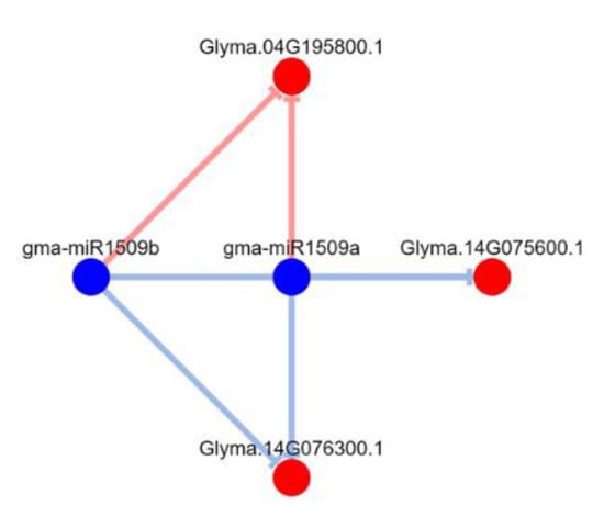 The target genes of miRNA were predicted by TargetFinder software [] with default parameters. The function and annotation of target genes was carried out using the Blast to Swiss-Prot (http://www.uniprot.org/ accessed on 1 Jaunary 2019), NCBI non-redundant protein sequence (Nr) (ftp://ftp.ncbi.nih.gov/blast/db/ accessed on 1 Jaunary 2019), and Pfam databases (http://pfam.xfam.org/ accessed on 1 Jaunary 2019) []. Then, DPMIND (http://202.195.246.60/DPMIND/ accessed on 1 Jaunary 2019) [], which is a degradome-based plant miRNA-target interaction and network database, provided us with a comprehensive retrieval and analysis platform to study the miRNAs and their verified targets in soybean.