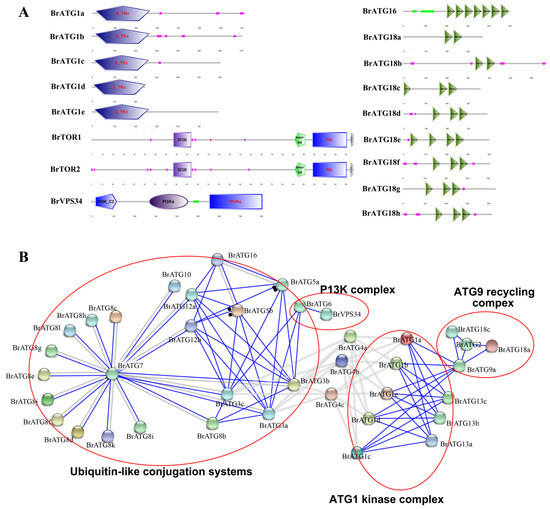 Conserved structural domains of BrATG protein (A), protein–protein interaction network (PPI) in BrATGs (B). Colored lines between proteins indicate evidence of various types of interactions.