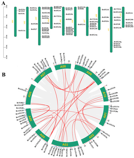 Chromosome distribution (A) and schematic representation of interchromosomal relationships (B) of the BrATG gene in Chinese cabbage. Repeated BrATG gene pairs are highlighted with red lines.