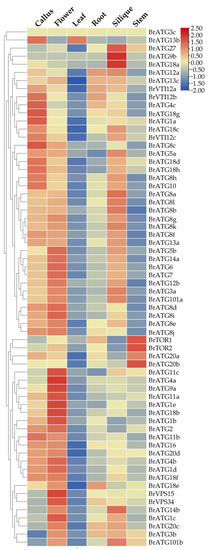 To analyze the specificity of BrATGs expression levels in six different tissues of Chinese cabbage, the expression levels of the BrATGs in calluses, flowers, leaves, roots, siliques, and stems were analyzed based on the RNA-seq data of Brassica rapa (Chiifu) cultivars, and the expression profiles of the BrCATs in different tissues and organs were found to be different. The results show that BrATGs were expressed at different levels in all tissues of Chinese cabbage (Figure 6). Most BrATGs were expressed at higher levels in the healing tissues and flowers, indicating that autophagy plays an important role in healing tissue production and reproductive growth in Chinese cabbage. Notably, BrATG20s and BrTOR showed high expression specificity in stem tissues compared to other tissues; BrVPS15 and BrATG34 were significantly expressed in flowers; and BrATG8a/8b/9b/18a/27 were specifically highly expressed in silique.