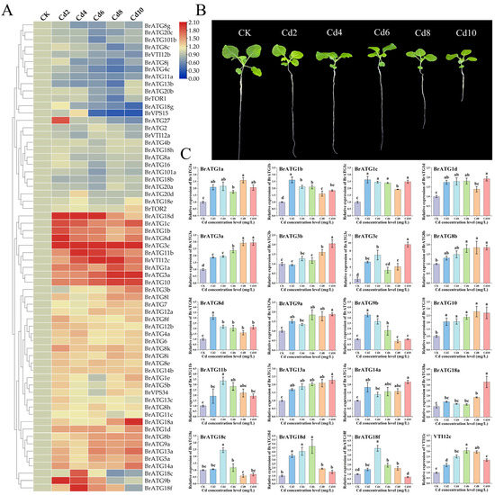 Analysis of BrATG gene expression profile under different levels of cadmium (Cd) stress. The expression of BrATG gene at different Cd concentrations was analyzed using qRT–PCR technique with BrACTN7 as an internal reference gene, and finally, the relative expression of BrATG gene was calculated using Equation 2−ΔΔCt, and the obtained data were visualized using TBtools software for heat map analysis (A); growth status of Chinese cabbage under Cd stress (B); BrATG genes that were partially significantly up-regulated under Cd stress, with different lowercase letters indicating significant differences (p < 0.05) (C).