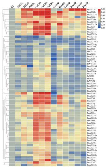 Analysis of gene expression patterns of BrATG genes under abiotic stresses (drought, NaCl, cold, and heat). Expression of 64 BrATG genes was detected using qRT–PCR under four stresses.