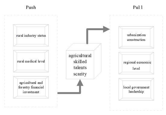 The scarcity of skilled agricultural talent is affected by population migration, and that can use the “push–pull” theory can explain the reasons. The theory holds that the driving forces of population migration are the push force of emigration and the pull force of immigration. Therefore, the push–pull theory is suitable for analyzing the problem of the lack of skilled agricultural talent. Bogue, D.J. [39] proposed this theory, the main point of which is as follows.