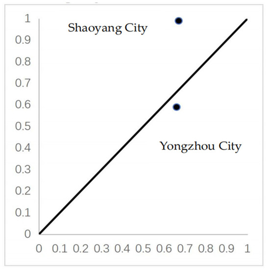 Configuration 1: . Three core causal conditions exist in this configuration: the rural industry status (present), regional economic development (absent), and urbanization (absent), which is because the three antecedent conditions simultaneously appear in the intermediate and parsimonious solutions. Among them, the rural medical level and financial investment in agriculture, forestry, and water conservancy contribute to causal conditions, and the local government leadership can be present or absent. The consistency of the configuration is 0.9665, and the unique coverage is 0.1624, which included two cases: Shaoyang and Yongzhou (as shown in Figure 3).