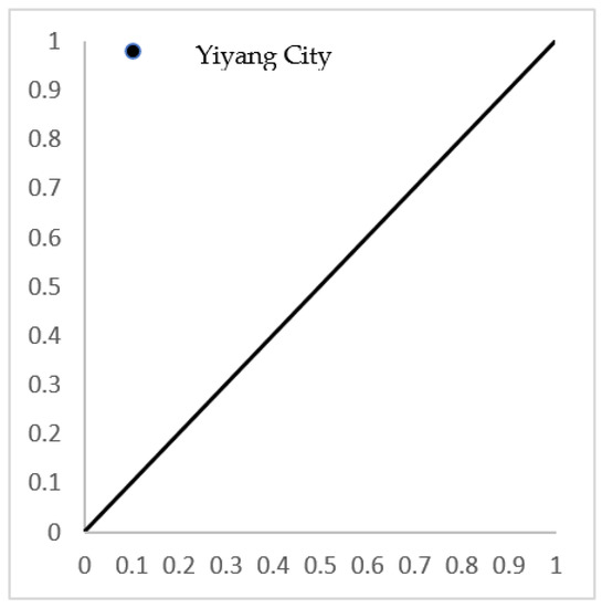 Configuration 3: . The core causal conditions are the rural industry status (present) and urbanization (absent) in this configuration, both of which appear in the intermediate and parsimonious solutions. The contributing causal conditions include the rural medical level (absent), regional economic development (present), financial investment in agriculture, forestry, and water resources (present), and local government leadership (absent). The consistency of this configuration is 1, which is the highest consistency of all the configurations, and the unique coverage is 0.0195. The case coverage was the city of Yiyang (as shown in Figure 5).