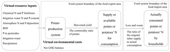 Two potato cultivation modes, namely conventional and optimized measures, were analyzed in this study. The conventional measure refers to local farmers’ experience management practices, which are mainly preoccupied with harvest yields, by applying relatively high water and fertilizer. The optimized practice refers to the knowledge-based measures aimed at improving potato yield by optimizing fertilizer N and water management practices and/or the cultivation modes and plant density of potatoes. We calculated the VNNF, VNPF, VIWF, and VTWF indicators of potatoes under conventional and optimized measures in the six cultivation regions from the perspective of consumption, based on the actually consumed potato or potatoes’ N by a household and the collected database of the new N and P, irrigation water and total water inputs in our previous study [], combining with the newly collected commodity ratio of potato at the field level (Table S1) and the differences between available potato supply and its actual consumption []. Meanwhile, we calculated the VNF, VPF, IWUE, WUE, and GHGI indicators of potatoes under conventional and optimized measures in the six cultivation regions from the perspective of production, based on the harvested potato or potatoes’ N in the production system and the database of the new N and P, the irrigation water and total water inputs, and net GHG balance in our previous study []. The calculation boundary of this study is shown in Figure 1.