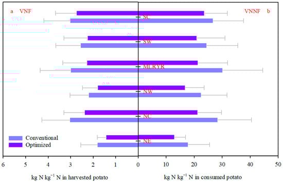 The VNFs of potatoes at the field level showed large differences between the six potato cultivation regions (Figure 2a). The lowest VNF of potatoes was in the NE (1.8 ± 0.7 kg N kg−1 N in the harvested potato), mainly due to the integrated impacts of a relatively lower chemical fertilizer input and a higher yield output in the NE than in other regions []. In contrast to the NE region, the highest VNFs of potatoes were 3.0 ± 1.3 kg N kg−1 N in the harvested potato in the NC and 3.0 ± 1.2 kg N kg−1 harvested potatoes’ N in the SC, which were mainly due to a 46.5–47.5% increase in the chemical fertilizer N inputs, with an 11.0–14.8% lower yield in the two regions, compared to the NE region. The VNF of potatoes could be reduced by 9.0–24.3% by optimizing the management practices (Figure 2a). The relatively larger reduction potential appeared in the MLRYR (24.3%), NC (21.4%), and NE (22.1%) regions, with the potential for a reduction in the chemical fertilizer N inputs of 19.5%, 13.2%, and 12.5%, while the yields could improve by 14.0%, 5.6%, and 13.2%, respectively, in three regions. These values indicate that the harvested potatoes had 1.8–3.0 and 1.4–2.7 kg of the new N input for production per unit N under the conventional and optimized measures, respectively, in the six agricultural regions. Our results were close to the VNF values of 1.8–4.0 and 1.1–2.3 kg N kg−1 N in the harvested potato under the conventional and optimized measures, respectively, in [] and significantly lower than the VNF values of 3.6–4.7 kg N kg−1 starchy roots’ N based on the literature [,]. With similar amounts of the new N inputs (163.7–199.0 kg N ha−1 in the literature vs. 177.5–264.2 kg N ha−1 in the conventional measures in this study), the collected potato yields in previous studies from the statistical data of the National Bureau of Statistics of China [] and the FAO database [] were lower by 32.7–55.8% than our yield data collected from the conventional measures in the published literature. The values in China were somewhat higher than the 1.0–1.3 kg N kg−1 N in the harvested potato in the USA and the EU [,] and the 0.9–1.4 kg N kg−1 harvested potatoes’ N in Njoro, Kenya []. In addition, they were significantly higher than the 0.5–0.8 kg N kg−1 N in the harvested potato in different water modes in southern Manitoba, Canada, in 2010–2011 [].