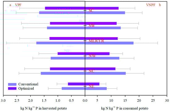 The VPFs of potatoes at the field level also showed large differences between the six potato cultivation regions under conventional measures (Figure 3a). The lowest VPF of potatoes was in the NE (0.9 ± 0.5 kg P kg−1 N in the harvested potato), as it had the highest yield with a chemical fertilizer P input that was lower by 27.4–71.0% than the remaining five regions; in contrast, the highest VPF of potatoes was in the MLRYR region (1.8 ± 1.1 kg P kg−1 P in the harvested potato) mainly caused by its use of the highest chemical fertilizer P input and the lowest yield []. These could be reduced to 0.6 ± 0.2 kg P kg−1 harvested potatoes’ P for the NE and to 1.5 ± 0.7 kg P kg−1 P in the harvested potato for the SW under the optimized measures (Figure 3a). These values indicate that for the harvested potatoes, there were 0.9–1.8 and 0.6–1.5 kg of new P input for the production per unit P under the conventional and optimized measures, respectively, in the six cultivation regions. We analyzed more than 90.0% of the new P inputs from chemical fertilizers in the six potato cultivation regions in a previous study []. The average VPF of Chinese potatoes was 1.1 kg chemical fertilizer P kg−1 P in the harvested potato under the optimized measures [], close to the values in this study. Our study values were relatively lower than the value of 1.3–2.1 kg chemical fertilizer P kg−1 P in the harvested potato in Njoro, Kenya []; however, except for the NE, they were higher than the value of 1.0 kg chemical fertilizer P kg−1 P in the harvested potato in the USA, which was calculated based on the total fertilizer P input for roots/tubers and the corresponding potato yield [,], as well as the 0.7–1.0 kg chemical fertilizer P kg−1 P in the harvested potato under different water modes in southern Manitoba, Canada, in 2010–2011 []. They were also significantly higher than the value of −0.4 kg P kg−1 P in the harvested potato in the EU [].