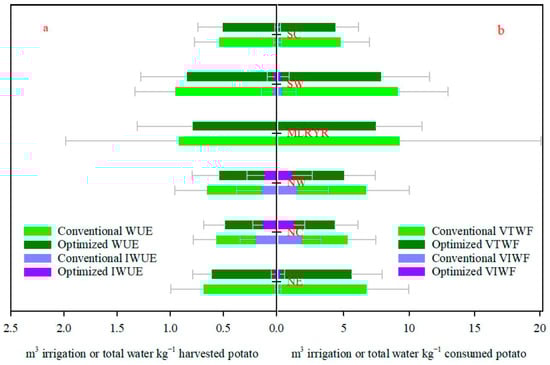 Aside from the mainly rainfed potato fields in the MLRYR, NE, and SC regions, the IWUEs of potatoes varied from 0.03 ± 0.1 to 0.2 ± 0.2 m3 irrigation water kg−1 standard yield at the field level under the conventional measures (Figure 4a). The WUEs of potatoes varied from 0.5 ± 0.2 to 1.0 ± 0.4 m3 total water kg−1 standard yield at the field level, under the conventional measures, in the six cultivation regions. The IWUEs and WUEs could be improved to 0.02 ± 0.07 to 0.1 ± 0.1 m3 irrigation water kg−1 standard yield and 0.5 ± 0.2 to 0.8 ± 0.4 m3 total water kg−1 standard yield, respectively, under the optimized techniques (Figure 4b). The IWUEs in the NC and NW under the conventional practices fell into the range of the 0.05 m3 irrigation water kg−1 standard yield for Manitoba, Canada [] and the 0.3–0.4 m3 irrigation water kg−1 standard yield under different irrigation modes in Njoro, Kenya []. The IWUEs in the NE, MLRYR, SW, and SC regions were significantly lower than the reported values in reference [] due to the mainly rainfed potato fields in the four regions.