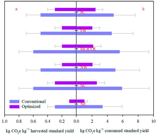 The GHGI indicator provides a platform for comparing the overall effects of different cropping systems on the GHG emissions per kilogram of yield at the field level [,,]. The GHGI of potato ranged from 0.3 ± 0.1 kg CO2e kg−1 standard yield for the NE to 0.6 ± 0.2 kg CO2e kg−1 standard yield for the NC, under the conventional measures (Figure 5a), close to the value of 0.6 ± 0.3 kg CO2e kg−1 standard yield for the Chinese potato as a whole, and these values fell into the range of the 0.2–2.3 kg CO2e kg−1 for the major crops in China [], except for the NE region. The lowest GHGI of potato was in the NE, mainly caused by it obtaining the highest yield with relatively low chemical fertilizers’ N input and almost no power used for irrigation due to the rainfed conditions. This was significantly higher than the 0.1 kg CO2e kg−1 standard yield for potatoes in Iran [] because of the high fertilizer input and relatively low yield of Chinese potatoes. This could be reduced by 47.1–67.6% by increasing the SOC storage and decreasing the abovementioned chemical fertilizer N and P inputs in the NE, NC, and MLRYR regions, as well as decreasing the power used for irrigation in the NC, under the optimized measures [].