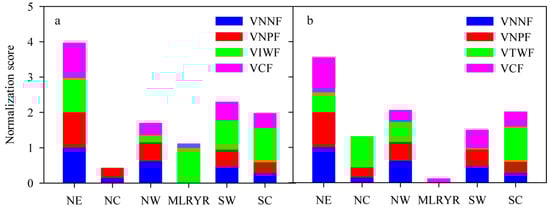 The normalization score of the six potato cultivation regions based on VNNF, VNPF, VIWF, and VCF indicators (a), and VNNF, VNPF, VTWF, and VCF indicators (b).