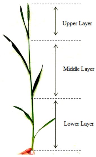 According to the standard NY/T612-2002 Rules for the investigation and forecast of wheat aphides [], the diagonal five-point sampling method was used in the field test. The main wheat aphids species in the test site in the flowering stage were Sitobion avenae and Schizaphis graminum. The quantity of aphids on 50 wheat plants was recorded at each sampling point regardless of the specific species of aphids, and then converted into the quantity of 100 wheat plants. In order to obtain the distribution characteristics of the aphids on wheat plants, the wheat plants were divided into upper, middle, and lower layers according to their physiological characteristics []. The upper layer was the part between the spike and flag leaf, the middle layer contained the part between the flag leaf and the third leaf, and the lower layer was the part from the third leaf to the root of wheat (Figure 1). The quantity of aphids was counted every two hours from 7 a.m. to 5 p.m., and the field temperature was recorded at the same time. The canopy height and leaf area index (LAI: one-sided green leaf area per unit ground area) of wheat were measured at each sampling point, and the arithmetic average was used as the LAI and canopy height of the wheat field population.