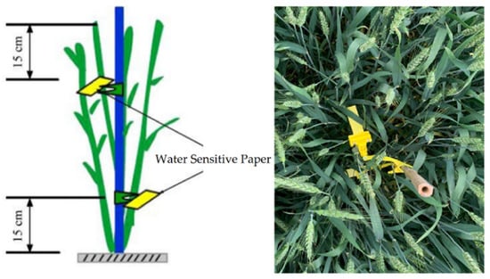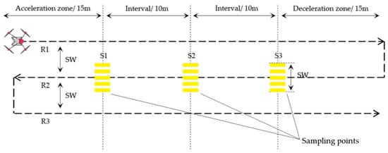 The arrangement of sampling points is shown in Figure 2. Considering that the SW boundary was affected by two adjacent routes at the same time, a total of three routes (R1–R3) were set-up. The sampling points were arranged on the central route (R2), and the central sampling points were coincided with R2. The distance between the adjacent sampling points on both sides was 25% of the SW set. A sampling rod was inserted at each sampling point, and the WSP was clamped on the sampling rod through a universal clamp. In order to ensure that the UAV could spray stably when passing the sampling area, 15 m acceleration and deceleration buffer zones were set at both ends of the route, and three rows of sampling points were set at 10 m intervals in the middle (S1–S3). The arrangement of WSP was divided into upper and lower layers, 15 cm away from the wheat plant canopy and ground, respectively (Figure 3). The WSP was labeled according to the location of the sampling points. After each test, the WSP was collected into sealed bags by the orders of the sampling points when the droplets on them were fully dried, and it was taken back to the laboratory for data reading and processing.