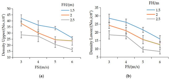 As shown in Figure 5a,b, at the same FH, with the increase in FS, the droplet coverage density of WSP in the upper and lower layers showed a downward trend. The maximum droplet density in the upper layer was 42.04/cm2 (A1 FS: 3 m/s, FH: 1.5 m), and the minimum was 16.33/cm2 (D3 FS: 6 m/s, FH: 2.5 m/s), with a decrease of 61.2%. The maximum droplet density in the lower layer was 28.53/cm2 (A1), and the minimum was 8.43/cm2 (D3), with a decrease of 70.5%. Therefore, in the application process of the crop protection UAV, reducing FS and FH could significantly increase the droplet coverage density in upper and lower layers of wheat.