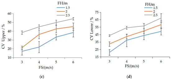As shown in Figure 5c,d, with the increase in the FS and FH, the droplet distribution uniformity gradually became worse, while the value of CV became larger. The minimum value of CV in the upper layer was 17.43% (A1 FS: 3 m/, FH: 1.5 m), and the maximum value was 54.17% (D3 FS: 6 m/s, FH: 2.5 m/s). The minimum value of CV in the lower layer was 24.2% (A1), and the maximum value was 67.23% (D3). Meanwhile, under the same operation parameters, the CV in the lower layer was larger than that in the upper layer. From this analysis, we can see that the reduction in FH and FS could significantly improve the droplet distribution uniformity in the upper and lower layers of the wheat canopy during the spraying operation.