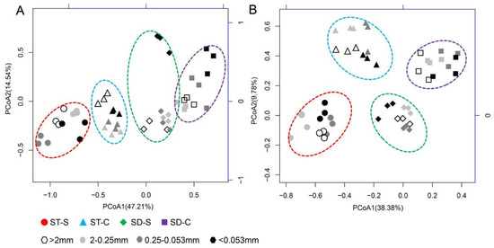 Unconstrained PCoA using the weighted UniFrac distance metric indicates the differences in the bacterial (A) and fungal (B) communities across various fractions of the suppressive and conducive soils. Samples from different soils and particle-size fractions are marked with different colors. Symbols for soils and different-sized fractions are described in Table 1. ST-S, silt loam-suppressive; ST-C, silt loam-conducive; SD-S, sandy loam-suppressive; and SD-C, sandy loam-conducive. Each sample includes three replications.