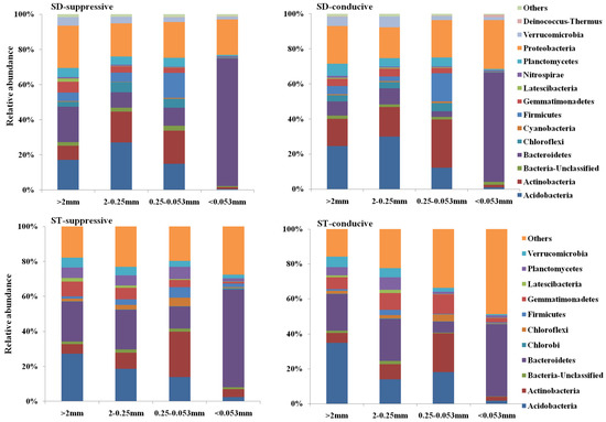 The distributions of the primary phyla in various PSFs of SD and ST soils (both the suppressive and conducive soils) were similar, in general. For example, the relative abundance of dominant bacterial phyla was larger than 1% across all the samples (both ST and SD), i.e., Acidobacteria, Actinobacteria, Bacteroidetes, Chloroflexi, Firmicutes, Gemmatimonadetes, Planctomycetes and Verrucomicrobia (Figure 2). There are two phyla that are present singly, i.e., Proteobacteria in SD and Latescibacteria in ST. The relative abundances of the bacterial phyla varied greatly over the aggregates of various sizes. For example, in the >0.053 mm-sized fractions, the relative abundances of the top five phyla (Acidobacteria, Actinobacteria, Bacteroidetes, Firmicutes and Proteobacteria) made up 70% of the total bacterial sequences (Figure 2), and in the 2–0.25 mm-sized fractions (with a proportion over 72%), the relative abundances of Actinobacteria, Firmicutes and Proteobacteria in the suppressive soils were all higher than those in the conducive soils, and the Bacteroidetes abundance is reversed (both SD and ST), while it was the dominant phyla in the <0.053 mm-sized fractions (Figure 2). In addition, the Bacteroidetes relative abundances in the suppressive soils were higher than those in the conducive soils. Furthermore, in the suppressive soils, the dominant genera with relative abundances >0.1% in the banana soils were Acidobacterium, Acidothermus, Bacillus, Bryobacter, Flavisolibacter, Pseudomonas, Sediminibacterium, Streptomyces, etc. (Figure S4A and S5A and Table S1). In the conducive soils, the dominant genera were Bacillus, Bryobacter, Gemmatimonas, Mizugakiibacter, Sediminibacterium, etc. (Figure S4B and S5B and Table S1). However, Flavisolibacter (3% to 16%) and Sediminibacterium (6% to 40%) clearly have higher abundances than the other genera in the <0.053 mm-sized fractions. In particular, the relative abundances of Pseudomonas in the SD suppressive soils were doubled compared to those of SD conducive soils (Table S1). Moreover, the contrast is even higher in ST because the abundance of Pseudomonas in the ST conducive soil is <0.1% (Table S1). In the >0.053 mm (>2, 2–0.25, 0.25–0.053 mm)-sized fractions in the SD suppressive soils, the Streptomyces abundances (0.31% to 0.51%) were higher than those (0.12% to 0.36%) in the SD conducive soils, suggesting that it could also be a potentially antagonistic microorganism.