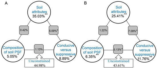 VPA map of the effects of the soil attributes, composition of soil particle-size fraction (PSFs), soil conditions (conducive or suppressive), and the interactions of these factors on the community structure of bacteria (A) and fungi (B). The soil attributes include the total carbon, total nitrogen, C/N, and the activities of urease, sucrase, catalase and neutral phosphatase. In the VPA map, “**” indicates a significance of p < 0.01; “*” indicates a significance of p < 0.05, and the percentage of variation explained by interactions between two or three of the factors is indicated as gray squares and circles on the sides.