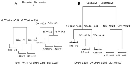 The MRT analysis was conducted to explore the relationships between multiple individual factors and the microbial community structure across all the samples (Figure 4). The soil condition (conducive or suppressive), C/N ratio and the percentage of <0.053 mm-sized fractions separated the bacterial community structure into three major clusters (Figure 4A). Similarly, the soil condition, C/N ratio and the percentage of >2 mm-sized fractions separated the fungal community structure into three major clusters, and these factors markedly affected the community (Figure 4B).