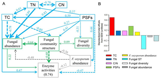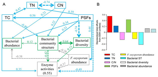 Structural equation modeling (SEM) shows the direct and indirect effects of the bacterial diversity, abundances and community structure on enzyme activities in the soils, in panel (A). Panel (B) shows the standardized total effects of each individual driver. Continuous and dashed arrows indicate positive (p < 0.05) and negative (p < 0.05) relationships, respectively. The blue, green and gray arrows represent the paths of the physiochemical factors, bacterial diversity, abundance and community structure, and the F. oxysporum abundance that affects the enzyme activities, respectively. Numbers following the included variables show the explained percentage of its variance by its predictors. The numbers on the arrows are the standardized path coefficients. The models fit the data well. Model fits are given in Table S4. TC, soil total carbon; TN, soil total nitrogen; C/N, C, N ratio; PSFs, the composition of soil particle-size fractions; Bacterial ST, bacterial community structure.