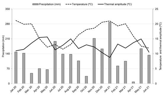 Monthly precipitation (mm), air temperature (°C), and thermal amplitude (°C) from the field experiment, Curitibanos, Santa Catarina, Brazil (January 2020 to June 2021). Data were obtained online: https://ciram.epagri.sc.gov.br (accessed on 23 August 2021).