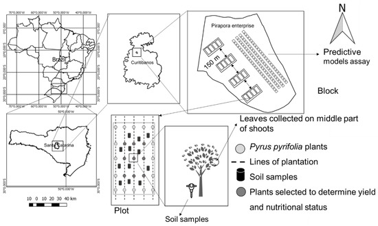 Leaf samples were collected from each of the nine plants placed in the central portion of each studied plot. We selected just nine plants per plot due to: (i) their homogeneity regarding nutritional status; (ii) reduced experimental error by avoiding plants located at the plots’ edge; and (iii) lack of diseases and pest damages in the leaf tissue. Some plants located at the plots’ edge showed leaf damage caused by beetles (e.g., Diabrotica speciosa (Germar)) and caterpillars, thus we avoided selecting these individuals for plant nutritional status assay. We collected 100 leaves per plot in January 2020 and 2021 as recommended by CQFS [33]. All leaves were collected from the middle part of the shoots. They were packaged in paper bags, rinsed with distilled water, dried at 60 °C for 72 h, and preserved until chemical analyses in plastic pots. To chemically characterize the leaves of P. pyrifolia from each studied plot, we analysed nitrogen, phosphorous and potassium contents. The N, P and K contents were measured by H2O2 and H2SO4 digestion according to Tedesco et al. [31].