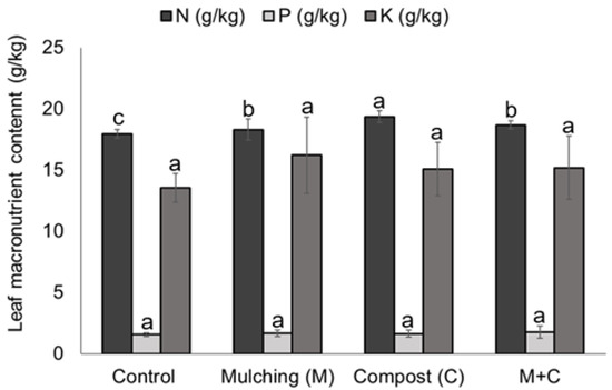 Significant differences among the use of compost, mulching and their interaction were found in leaves’ N content. For leaves’ P and K content, no significant differences among the use of compost, mulching and their interaction by the two-way ANOVA were found. The highest values of leaves’ N content in P. pyrifolia plants were found on plots where compost was applied (Figure 3).