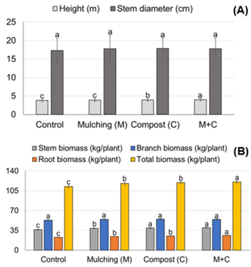Significant differences among the use of compost, mulching and their interaction were found for height (p < 0.001), stem biomass (p < 0.01), root biomass (p < 0.001), and total biomass (p < 0.01). For stem diameter, and branch biomass, we did not find any significant differences among the use of compost, mulching and their interaction by the two-way ANOVA. The highest values of plant height, stem biomass, root biomass, and total biomass were found on plots where compost and mulching were applied (Figure 4). For stem biomass and total biomass, we did not find significant differences between plots where we used only the compost and plots that received the combination of compost and mulching (Figure 4).