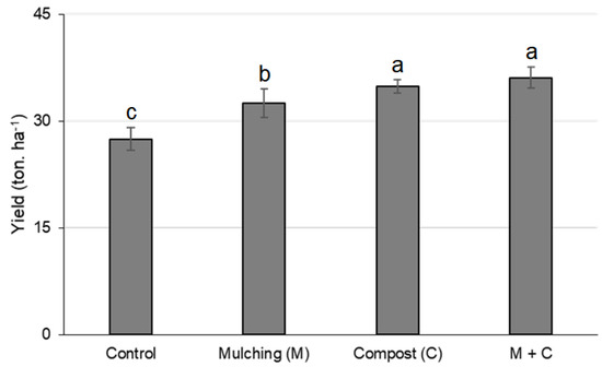 There is a significant difference in P. pyrifolia yield when comparing the use of compost, mulching, and their interaction. The highest values of P. pyrifolia yield were found on plots that received the combination of compost and mulching. We did not find significant differences for P. pyrifolia yield between the plots that received just the compost, and the combination with compost and mulching (Figure 5).