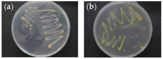 The microbial isolates with orange (a) and yellow colonies (b) from an ozonated immersion solution of packed tofu stored at 4 °C for 6 days.