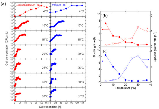 where td is the doubling time, μ is the specific growth rate (1/time). The optimal growth temperature for each microorganism was estimated to be around 30 °C, at which the doubling time was at its minimum and the specific growth rate was at its maximum (Figure 2b,c). The value was close to the optimal temperatures of other strains, for example, 34 °C for E. oxidotolerans T-2-2T [23] and 30 °C for P. agglomerans CPA-2 [39]. According to Morita’s definition [53], Exiguobacterium sp. and Pantoea sp. were classified as psychrotrophic bacteria because they can grow at low temperatures (0–5 °C) with an optimum growth temperature above 20 °C.