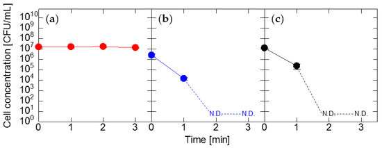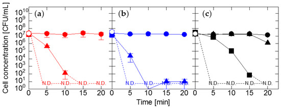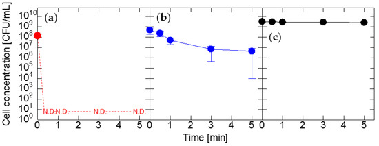 Sodium hypochlorite solution (197-02206, FUJIFILM Wako Pure Chemical Corp., Osaka, Japan) and sodium thiosulfate pentahydrate (197-03585, FUJIFILM Wako Pure Chemical Corp., Osaka, Japan) were used as received. Cell suspensions of 1 mL were dispensed into test tubes, and equal volumes of diluted sodium hypochlorite solutions were added to obtain final sodium hypochlorite concentrations of 0.25, 0.5, 1, 2, and 5 ppm, respectively. The mixtures were allowed to stand for 5 min at room temperature, and 0.1 mL of sample solutions were collected at 30 s intervals for the first 1 min and at 2 min intervals for the next 4 min. The collected samples were immediately neutralized with sodium thiosulfate solutions and serially diluted with distilled water. Then, 0.1 mL of the dilutions of Exiguobacterium sp. and Pantoea sp. cells and E. coli cells were plated on nutrient agar plates and LB agar plates, respectively. After incubation at 37 °C for 24 h, colonies were counted to determine the number of CFUs. Each experiment was performed three times. The data in the figures are means of the experimental results and error bars indicate maximum and minimum values.
