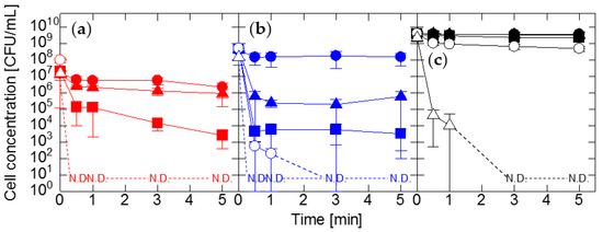 Effect of sodium hypochlorite treatment on Exiguobacterium sp. (a), Pantoea sp. (b), and E. coli (c). Symbols indicate concentrations of 0.25 ppm (closed circles), 0.5 ppm (closed triangles), 1 ppm (closed squares), 2 ppm (open circles), and 5 ppm (open triangles). N.D. means not detected.