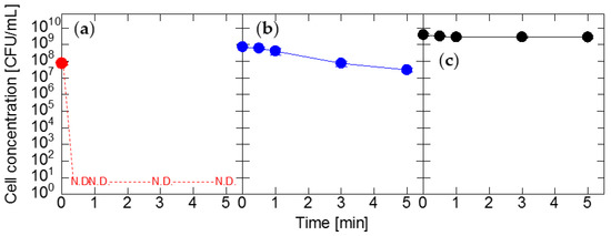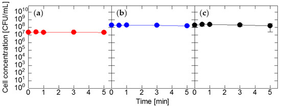 In order to investigate the sensitivities of Exiguobacterium sp., Pantoea sp., and E. coli to alkaline conditions, these microorganisms were treated with a sodium hydroxide solution (pH 8.00). As shown in Figure 7, no bactericidal effect against each microorganism was observed, even after 5 min of treatment time. This result suggests the potential risk that alkaline sanitizers, such as sodium bicarbonate solution [72] and neutral electrolyzed water (NEW) [73], are ineffective to these microorganisms. However, if the alkaline sanitizers contain other biocidal reagents, the bactericidal effect should be expected because these microorganisms were inactivated by 2 and 5 ppm sodium hypochlorite solutions, with pH values of 7.68 and 8.19, respectively (Figure 4). NEW seems to be an effective sanitizer against these microorganisms because it contains HOCl and −OCl [73].